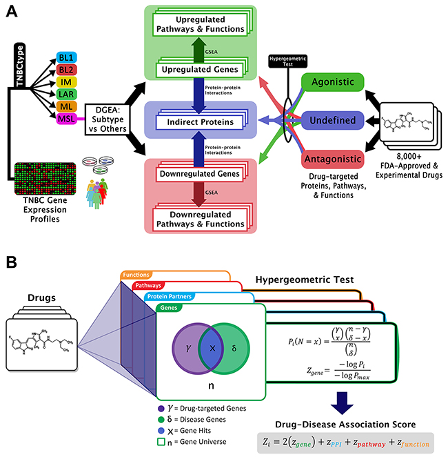 Figure 2: Graphical representation of GenEx-TNBC. (A) From the left side, patient or cell line TNBC gene expression data are subtyped and differentially expressed genes are found for one subtype relative to all other subtypes. Up- and down-regulated genes are separately enriched for subtype-associated pathways and functions, and connected to indirect proteins interacting with those gene products. Drug-protein interactions with a known directional effect are matched to oppositely-regulated genes, pathways, and functions, while those with unknown effect are matched to disease-associated indirect proteins and biological entities regulated in either direction. (B) The hypergeometric test uses a hypergeometric distribution to determine the statistical significance of having x drug hits in a sample of δ subtype-associated biological entities. The legend describes the example case of gene level coincidence. Log-transformed p-values for each level of biological activity are summated to produce a drug-disease association score.