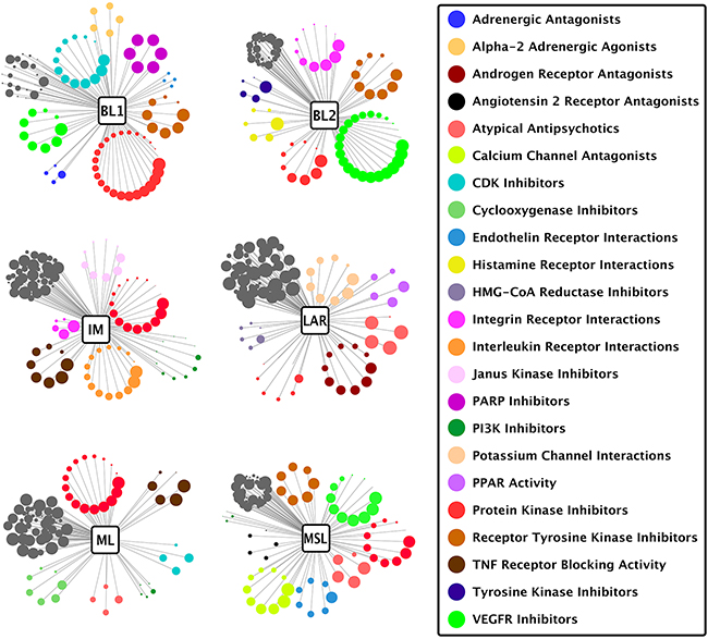 Figure 4: Drug classes matched to TNBC subtypes. Each circle represents one drug from the top 100 drugs ranked against the subtype shown, wherein the diameter of the circle corresponds to rank position (better-ranked drugs have larger diameters) and the color of the circle indicates a drug class listed in the legend on the right. Drug classes with at least 4 drugs in the top 100 are depicted radially. Dark grey non-radial clusters represent drugs with classes not highlighted for the given subtype, and may contain drug classes listed in the legend. Drug class data were derived from the FDA NDC directory and by manual designation using GenEx-TNBC drug target profiles.