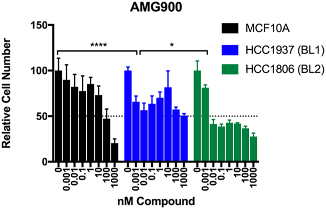 Figure 6: Testing of the pan Aurora kinase inhibitor AMG900 in basal-like TNBC cells. Crystal violet staining of MCF10A (non-cancer), HCC1937 (BL1), and HCC1806 (BL2) cells grown in the presence of the indicated concentrations of AMG900 for seven (7) days. Data for each cell line were normalized to the appropriate DMSO control. Two-way ANOVA with Bonferroni post hoc multiple comparisons test (asterisks indicate per-dose comparison of HCC1806 or HCC1937 to MCF10A). Data are presented as the mean +/- standard deviation (S.D.) for a single experiment performed with 6 technical replicates that is representative of at least two independent experiments (biological replicates).