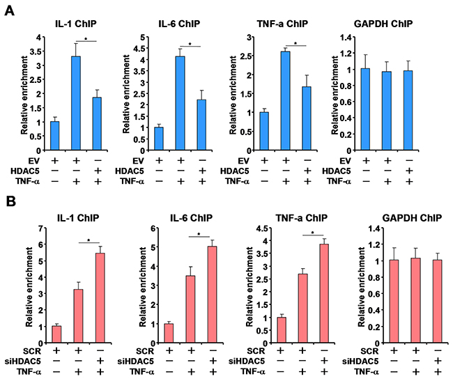 Figure 4: HDAC5 alters the recruitment of MKL1 to pro-inflammatory gene promoters. (A) THP-1 cells were transfected with HDAC5 expression construct or an empty vector (EV) followed by treatment with TNF-α (10ng/ml) for 12 hours. ChIP assays were performed with anti-MKL1. (B) THP-1 cells were transfected with siRNA targeting HDAC5 or scrambled siRNA (SCR) followed by treatment with TNF-α (10ng/ml) for 12 hours. ChIP assays were performed with anti-MKL1. All experiments have been repeated three times.