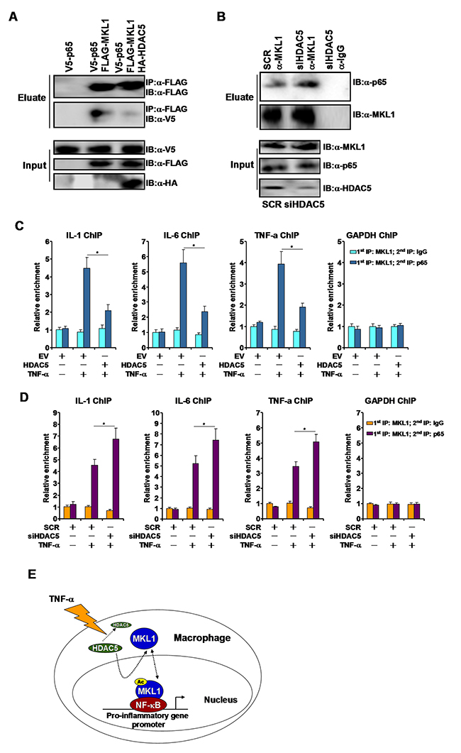 Figure 6: HDAC5 disrupts the interaction between MKL1 and p65. (A) FLAG-tagged MKL1 and V5-tagged p65 were transfected into HEK293 cells in the presence or absence of HDAC5. Immunoprecipitation was performed with anti-FLAG. (B) THP-1 cells were transfected with siRNA targeting HDAC5 or scrambled siRNA (SCR) followed by treatment with TNF-α (10ng/ml). Immunoprecipitation was performed with anti-MKL1. (C) THP-1 cells were transfected with HDAC5 expression construct or an empty vector (EV) followed by treatment with TNF-α (10ng/ml). Re-ChIP assays were performed with indicated antibodies. (D) THP-1 cells were transfected with siRNA targeting HDAC5 or scrambled siRNA (SCR) followed by treatment with TNF-α (10ng/ml). Re-ChIP assays were performed with indicated antibodies. (E) A schematic model. All experiments have been repeated three times.