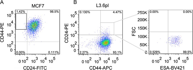 Figure 1: Isolation of breast CD44+CD24- CSCs and pancreatic CD44+CD24+ESA+ CSCs from MCF7 and L3.6pl cells by flow cytometry. (A) Typical proportion of CD44+CD24– cells in MCF7 cells. The isolated CD44+CD24– CSCs were obtained as shown in the frame of A and cultured 1d for re-analysis by flow cytometry (Supplementary Figure 1A). (B) Fluorescence activated cell-sorting (FACS) analysis to measure CD44 and CD24 expression of L3.6pl cells (Left) and the patterns of ESA staining of CD24+CD44+ cells as shown in the frame of panel B Left (Right).