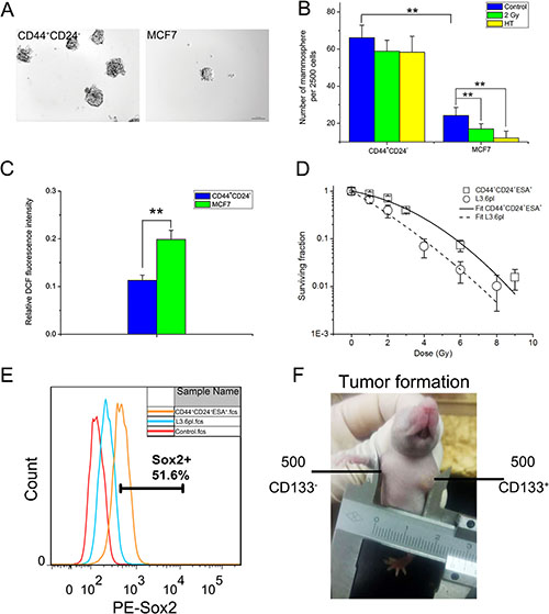 Figure 2: Identification of sorted breast CSCs and pancreatic CSCs in vitro and in vivo. (A) Typical mammosphere formation of CD44+CD24– cells and MCF7 cells imaged by 10x objective (Bar = 100 μm). (B) Quantification of mammospheres derived from CD44+CD24– cells and MCF7 cells at day 7 after sham-treated, HT (43°C for 2 hours) or 2 Gy treatment. (C) Intracellular ROS concentrations of CD44+CD24– cells and MCF7 cells. (D) Clonogenic survival assay in cells derived from CD44+CD24+ESA+ cells (squares) and L3.6pl cells (circles). To determine surviving fractions, counts were normalized using the plating efficiency of the unirradiated corresponding control. The survival curves of CD44+CD24+ESA+ cells (solid line) and L3.6pl cells (dashed line) were fitted using LQ model respectively. (E) FACS analysis to measure Sox2 expression of L3.6pl cells and CD44+CD24+ESA+ cells. (F) Representative experiment depicting tumor formation in a mouse at the injection site of 500 CD133+ cells, with no tumor formation seen at the injection site of 500 CD133- cells. The results are presented as the mean ± SD, as determined from three independent experiments. **P < 0.01.