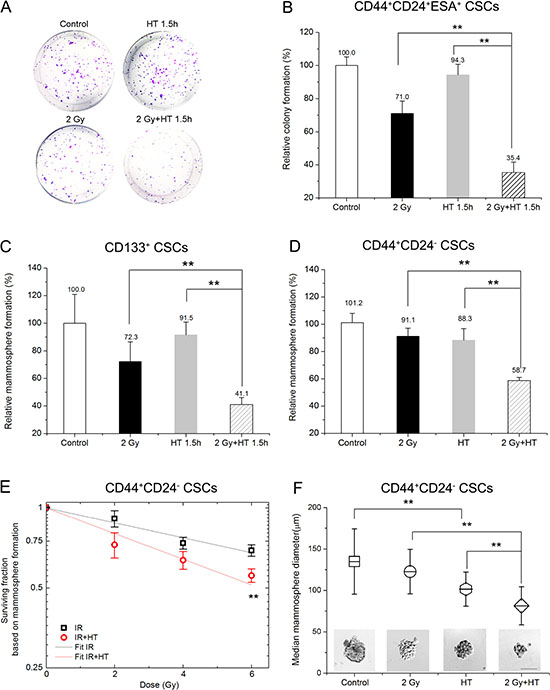 Figure 3: Hyperthermia sensitized breast CSCs and pancreatic CSCs to radiation. (A–B) Representative images of colonies derived from CD44+CD24+ESA+ CSCs after sham-treated, HT (43°C for 1.5 hours), 2 Gy or 2 Gy+HT treatment (A) and quantification of colonies (B). (C) Quantification of mammospheres derived from CD133+ CSCs at day 7 after sham-treated, HT (43°C for 1.5 hours), 2 Gy or 2 Gy+HT treatment. (D) Statistics in mammosphere formations derived from CD44+CD24- CSCs at day 7 after sham-treated, HT (43°C for 2 hours), 2 Gy or 2 Gy+HT treatment. (E) The mammosphere survival of CSCs after IR alone (squares) or IR+HT (circles) treatments. The dose-response curve of IR alone (black line) or IR+HT (red line) was fitted using the linear part of LQ model. (F) Representative images of mammosphere derived from CD44+CD24- CSCs after different treatments. Bar = 100 μm (bottom) and mean values for mammosphere diameters of the indicated treatment groups. At least 40 mammospheres were measured in each group. The results are presented as the mean ± SD, as determined from three independent experiments. *P < 0.05, **P < 0.01.