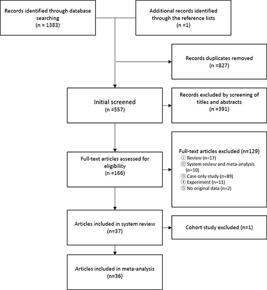According to the established search strategy and inclusion criteria, after screening and detailed examination, a total of 37 eligible articles were selected (Figure 1). 36 of them were case-control studies (24 allogeneic case-control studies [11–34], 8 self-matched case-control studies [35–42], 3 nested case-control studies [43–45] and 1 nested and allogeneic case-control study [46]), including 6,980 cases of lung cancer and 7,474 controls. One population-based cohort study from China was also included. In that study, the incidence of lung cancer in 24,162 HPV-infected patients was compared to 1,026,986 uninfected individuals. After adjusting for age, sex, income, residence and concomitant diseases, there was a significant increase in the risk of lung cancer among women who were exposed to HPV infection (RR = 1.263, 95% CI: 1.015–1.571, P = 0.0367), while no significant association was found among men (RR = 1.169, 95% CI: 0.984–1.390, P = 0.0754). However, this cohort-study lacked information on individual lifestyle, smoking, diagnostic criteria for HPV infection, and detailed HPV types.