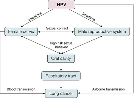 HPV belongs to the papillomaviridae, a large family of epitheliotropic DNA viruses. HPV gene expression and the viral life cycle are tightly controlled by epithelial cell differentiation. It is assumed that scratching of the epithelial tissue allows the virus to infect undifferentiated cells in the basal layers of stratified squamous epithelium [8]. According to the character of HPV, which has a high degree of affinity to the squamous epithelium and the feature of bronchus and lung, whose main tissue type was epithelial tissue, so it is postulated that HPV is probably related with lung neoplasms.