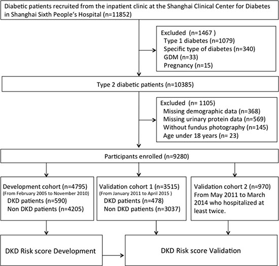 All patients were recruited from the inpatient clinic of the Shanghai Clinical Center for Diabetes in Shanghai Sixth People’s Hospital (Shanghai, China). They completed a uniform questionnaire containing of questions about their histories of current and previous illnesses and medical treatment. Exclusion criteria were cancer, severe psychiatric disturbance, chronic kidney disease, pregnancy, and glucocorticoid treatment. Type 2 diabetes was diagnosed based on the American Diabetes Association guidelines (2006). Diabetic kidney disease was diagnosed according to the criteria of the NKF-KDOQI (2007) [4]. After excluding 368 individuals with missing demographic data, 569 with missing urinary protein data, 145 without fundus photography, and 23 aged < 18 years, 9,280 patients were enrolled in the study. A total of 4,795 participants recruited from February 2005 to November 2010 were included in the development cohort, 3,515 patients enrolled from January 2011 to April 2015 were included in validation 1, and 970 patients with type 2 diabetes mellitus without DKD who were hospitalized at least twice were recruited for validation 2 (Figure 1). In validation 2 population, the first and last hospitalization information was used for analysis (median observation period 2.7 years, interquartile range 1.6–4.2 years). All studies were approved by the Ethics Committee of Shanghai Jiao Tong University Affiliated Sixth People’s Hospital, and informed consent was obtained from all participants.