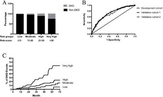 Figure 2: (A) Prevalence of DKD in four risk groups stratified by risk score in the development population. (B) Receiver operating curve (ROC) for the development, validation 1 and validation 2 cohorts. The AUC of development, validation1 and validation 2 were 0.713(0.692–0.734), 0.720 (0.696–0.744) and 0.696(0.632–0.760), respectively. Difference between the curves for DKD was not significant (U = 0.43, P = 0.667). (C) Kaplan-Meier curve of DKD end point for each risk group. Moderate group: HR 2.04 (95% confidence interval [CI] 0.76 to 5.46), P = 0.23. High group: HR 3.97 (95% CI 1.90 to 8.33), P = 0.01. Very high group: Hazard ratio (HR) 11.37 (95% CI 4.76 to 27.19), P < 0.0001. Low risk group: Reference.