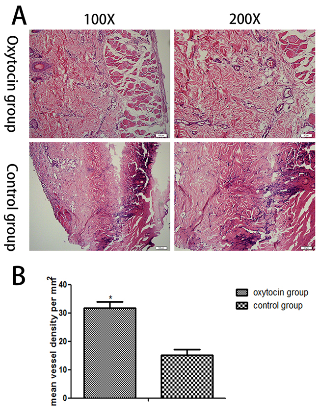 Random skin flap transplantation has been used to repair and rebuild skin soft tissue. Flap transfer is technically simple, and flap color and texture can be matched to those of the recipient site [19, 20]. However, distal flap necrosis remains a major challenge [21, 22]. It was demonstrated that OT injection significantly increases the plasma levels of IGF-1 and NGF and improves musculocutaneous flap survival [16]. However, musculocutaneous flap is a compound tissue flap utilizing a piece of muscle (or part of muscle) from body and is along with its shallow subcutaneous tissue, which is transfered for repair of large wound defects or reconstruction of muscle function and whose pedicle is the vascularities entering the muscle [23-25]. With rich muscles and vascularities, musculocutaneous flap causes so many factors influencing the detection about effects of drugs on flaps. Compared with musculocutaneous flap, random skin flap is the flap that doesn’t contain shaft blood vessels or well-known vessels [18], so we choosed random skin flap model for more intuitive study about machanism of OT on flaps.