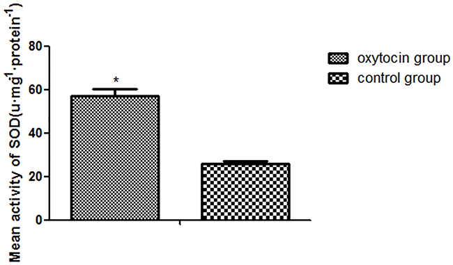 Figure 4: SOD expression levels in the two groups (*p < 0.01 vs. the control group). All values are means ± standard deviations (SDs). n = 6 per group.
