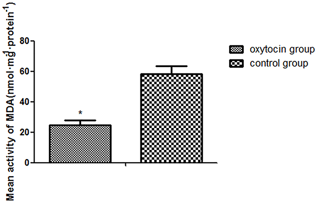 Figure 5: Mean MDA expression levels in the two groups (*p < 0.01 vs. control group). All values are expressed as means ± standard deviations (SDs). n = 6 per group.