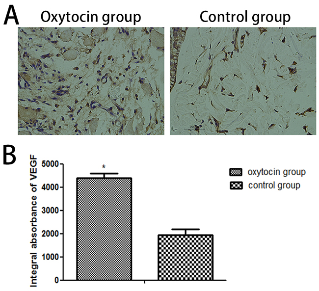 The expression of VEGF was assessed immunohistochemically. The remaining paraffin sections from H&E were subjected to Elivison two-step staining. Firstly, each sample was added with normal goat serum blocking solution, allowed to stand for 20 min at room temperature, and then added with 50ul mouse anti-rat VEGF antibody (primary antibody, working concentration 1: 100). Secondly, we let slices stay at 4°C overnight. Following this, samples were rewarmed at 37°C for 45 min and rinsed with phosphate buffer solution(PBS). Fourthly, dropping 50ul goat anti-mouse secondary antibody (working concentration 1:50), the slices were incubated at 37°C for 1 hour and washed with PBS. Fifthly, for the sake of color development, we incubated the slices in 3,3-diaminobenzidinetetrahydrochloride (DAB) solution for 5 ~ 10 min. The BX51 optical microscope (Olympus, Japan) was used to find the positive expression region of VEGF at a low magnification. Next, the DP2-TWAIN image acquisition system (Olympus, Japan) was selected by observing each slice with high magnification. Fianlly, the integral absorbance(IA) values was read using Image-Plo Plus v 6.0 software (US Media Cybernctics) to represent VEGF expression levels.