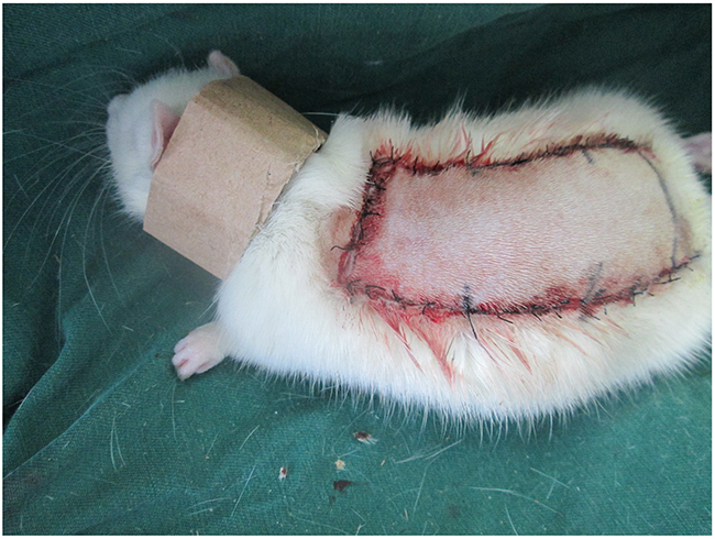 After injection, each flap survival area was observed visually during the 7 days, including flap appearance, color, texture and hair condition macroscopic changes developing. Rats dorsum in each group were covered with clear paper in anesthesia to accurately measure the survival or necrotic area of the flap and cut into two parts: survival and necrosis. According to the following formula to calculate the flap survival area ratio: