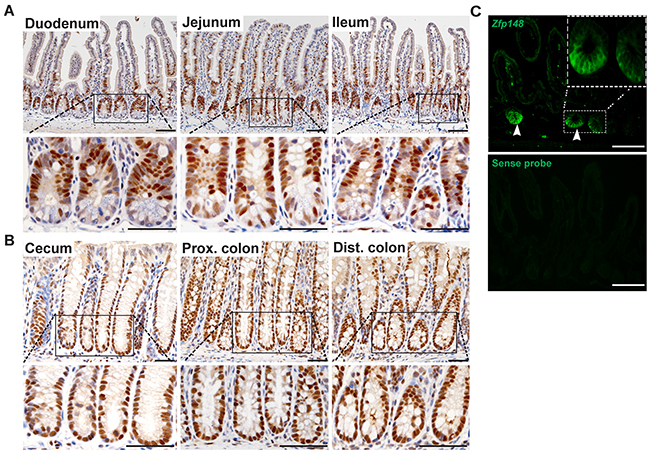 Figure 1: ZBP-89 is highly expressed in CBCs and TA cells. Representative images of immunohistochemistry for ZBP-89 in the (A) small intestine and (B) colon. (C) Zfp148 in situ hybridization in the small intestine. The sense probe was used as the negative control. Scale bar=100μm. Inset of CBCs at 200μm