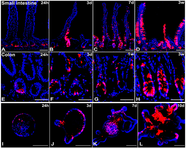 Isolated crypts were incubated in culture medium for 45min at 37°C, followed by cell dissociation using Accutase (STEMCELL) for 15min at 37°C. Dissociated cells were filtered through a 40μm pore cell strainer (BD Bioscience). TdTomato positive cells were sorted by flow cytometry using an iCyt Synergy Flow sorter (Sony Biotechnology). Single viable epithelial cells from both the intestine and colon were gated by forward scatter, side scatter, pulse-width parameter and by negative staining for DAPI (Sigma Aldrich). Sorted cells were collected in crypt culture medium, embedded in Matrigel and then overlaid with complete culture media.
