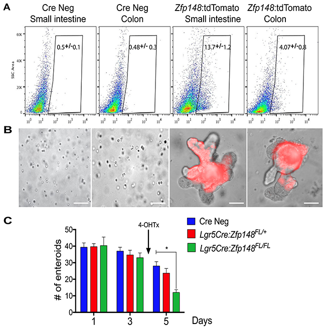 Figure 3: Single cell sorting of Zfp148: tdTomato+ cells and deletion of Zfp148 in stem cells. (A) Single cell sorting of Zfp148: tdTomato positive cells from the small intestine and colon. Gate of fluorescent cells isolated from the CreNeg versus Zfp148CreERT2+ mice 24h after one dose of Tx (0.1mg/g body weight). Shown is the median percentage ±SEM for tdTomato+ sorted cells from N=3 mice per tissue per genotype. (B) Representative images of sorted cells cultured in Matrigel after 3 days in culture. (C) Graph showing total number of small intestine organoids per day. Shown is the mean ±SEM. *** P< 0.0001 ANOVA with Tukey’s multiple comparisons. N=3 passages of organoids pooled from 3 mice and cultured in triplicate per time point. Arrow indicates the addition of 4-OH-Tx added after the organoids were in culture for 3 days. Scale bars =100μm.