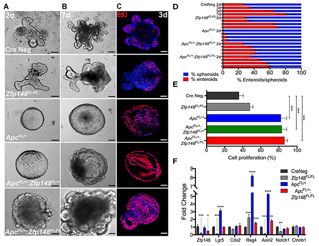 Figure 5: Deletion of Zfp148 induces cell differentiation in Cdx2:ApcFL/+ organoids. (A, B) Images of colonic organoid morphology for each genotype after 2 and 7 days in culture (Cre Neg.; Cdx2: Zfp148FL/FL ; Cdx2: ApcFL/+; Cdx2: ApcFL/+:Zfp148FL/+ and Cdx2: ApcFL/+:Zfp148FL/Fl). (C) Confocal images of EdU incorporation per genotype after 3 days in culture. Scale bar = 100μm. (D) Mean percentage ±SEM for organoid morphology per total structures (organoids/spheroids) at day 2, 3, 5 and 7 after culturing in Matrigel in triplicate for three passages from 3 mice per genotype. (E) Mean percentage ±SEM of EdU+ nuclei, using 2-3 organoids per image. Five images per genotype per condition were quantified. (F) qPCR using three passages of organoids per genotype. Shown are means ±SEM, ****P< 0.0001 ***P< 0.001, **P< 0.005, *P< 0.05 by two-way ANOVA Tukey’s multiple comparisons test.