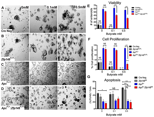 Unlike the small intestine, tumors in the colon emerge in the presence of commensal bacteria that ferment carbohydrates into millimolar amounts of butyrate, a short chain fatty acid (SCFA) with the most potent HDAC inhibitory activity [18, 19]. Organoid cultures are usually carried out in the absence of butyrate or bacteria. Indeed, butyrate generally suppresses colonic cell growth, which might explain the persistent proliferation of the organoids carrying a mutant Apc allele (Figure 5). Therefore, we examined whether adding butyrate to the organoid cultures affected their growth. Colonic organoids from both WT (CreNeg) and Cdx2Cre:Zfp148FL/FL mice were treated with 0.5mM butyrate, which induced a significant increase in apoptotic cells and suppressed cell proliferation compared to the group with no butyrate (Figure 6A, 6B). Under these conditions, colonic organoids carrying the Apc deletion (Cdx2Cre: ApcFL/+) maintained their spheroid shape and thrived in the presence of butyrate (0.5mM) even though the same concentrations of butyrate were poorly tolerated by normal colon organoids (Figure 6C, 6D). However, deletion of Zfp148 (Cdx2Cre: ApcFL/+: Zfp148FL/FL) reduced organoid proliferation in the presence of butyrate (Figure 6E, 6F), but there was no significant increase in apoptosis (Figure 6G), suggesting that loss of Zfp148 in the presence of butyrate might initiate cellular senescence (growth arrest) in contrast to apoptosis [20]. By contrast, intestinal organoids exhibited greater sensitivity to butyrate (Figure 7A-7E). Senescence was observed in the Apc and Apc plus Zfp148-deleted intestinal organoids even at 0.1 mM butyrate, while both the Cre Neg and Zfp148-deleted organoids without the Apc deletion were already apoptotic at this lower butyrate concentration (Figure 7F).