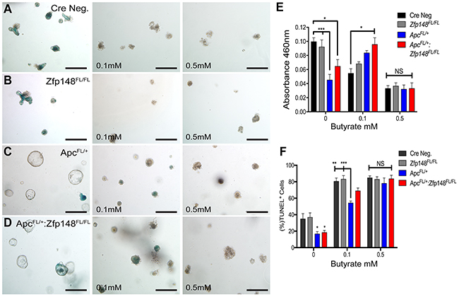 Figure 7: Intestinal organoids show greater sensitivity to butyrate than colon organoids. Representative pictures of intestinal organoids stained for senescence-associated beta galactosidase (SA-βGal) activity before and after treating with increasing butyrate concentrations. (A) Cre Neg., (B) VillinCre:Zfp148FL/FL, (C) VillinCre:ApcFL/+ and (D) VillinCre:ApcFL/+: Zfp148FL/FL. Scale bar=100μm. (E) Spectrophotometric quantitation of intestinal organoids SA-βGal activity at A460. (F) TUNEL assay, shown as the percentage of TdT positive cells for each population per number of DAPI positive cells. *P< 0.05, **P< 0.001 and ***P< 0.0001 by two-way ANOVA Tukey’s multiple comparisons test.