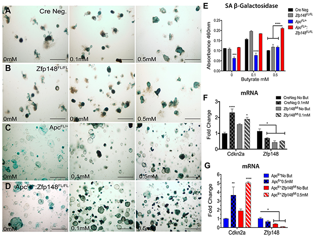 Figure 8: Loss of Zfp148 in the presence of butyrate initiates cellular senescence in ApcFL/+ organoids. Representative pictures of colonic organoids stained for senescence-associated beta galactosidase (SA-βGal) activity before and after treating with increasing butyrate concentrations (A) Cre Neg., (B) Cdx2Cre:Zfp148FL/FL, (C) Cdx2Cre:ApcFL/+ and (D) Cdx2Cre:ApcFL/+: Zfp148FL/FL. Scale bar=100μm. (E) Spectrophotometric quantification of colonic organoids SA-βGal activity at A460. (F) qPCR for Cdkn2a and Zfp148 using three passages of CreNeg and Cdx2: Zfp148FL/FL colonic organoids incubated with 0.1mM butyrate. (G) qPCR for Cdkn2a and Zfp148 using three passages of Cdx2: ApcFL/+:Zfp148FL/+ and Cdx2: ApcFL/+:Zfp148FL/Fl colonic organoids incubated with 0.5mM butyrate. *P< 0.05, **P< 0.001 and ***P< 0.0001 by two-way ANOVA Tukey’s multiple comparisons test.