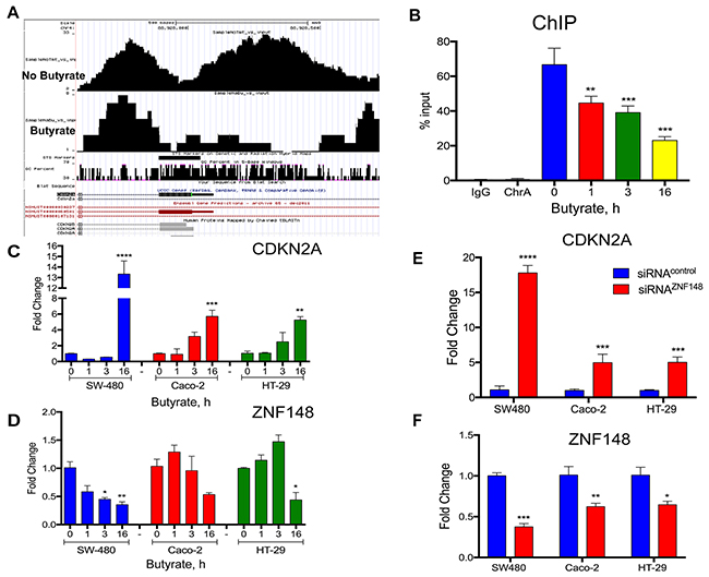 Figure 9: Butyrate decreased ZBP-89 binding to the mouse and human p16Ink4a promoter. (A) ChIP-Seq of mouse STC-1 cells treated with 2.5mM butyrate for 6h. Chromatin precipitated with ZBP-89 antibody was analyzed in the UCSC genome GRC m38/mm10 browser. (B) Chromatin Immunoprecipitation of SW480 cells treated with butyrate for 1, 3 and 16h. Occupancy of the CDKN2A promoter by ZBP-89 determined by qPCR was plotted as a function of the input. (C) SW480, Caco-2 and HT-29 cells treated with butyrate for 1, 3 and 16h were analyzed by qPCR for CDKN2A mRNA and (D) ZNF148 mRNA. (E) SW480, Caco-2 and HT-29 cells incubated for 24h with ZNF148 siRNA or siRNA scrambled control oligos and then treated with butyrate for 1, 3 and 16h were analyzed by qPCR for CDKN2A mRNA and (F) ZNF148 mRNA. Shown are means ±SEM, ****P< 0.0001, ***P< 0.001, **P< 0.05, by one-way ANOVA multiple comparisons test.