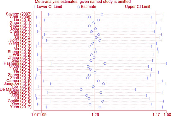 We first conducted Q test and I2 statistics to test between-study heterogeneity. Heterogeneity was indicated among all five genetic models as P < 0.001. Thus, the random-effect model was employed to generate wider CIs. As to the sensitivity analysis, the leaving each study out strategy showed that no substantial changes in ORs were observed after omitting each study (Figure 3). This reflects the stability and reliability of this meta-analysis.