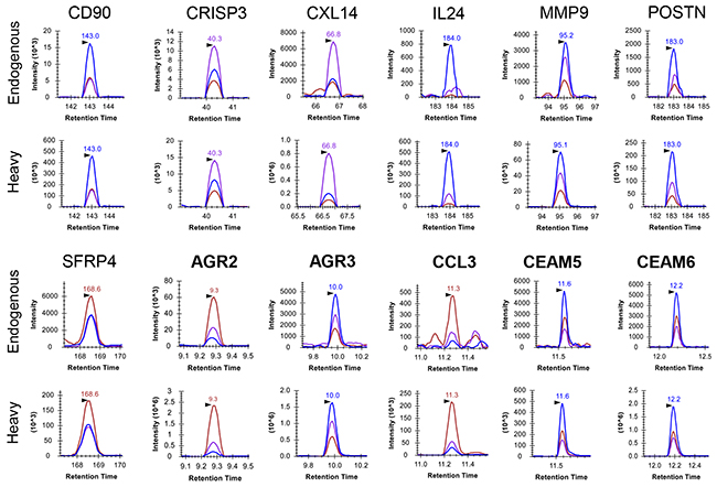 Figure 1: Extracted ion chromatograms (XICs) of detected proteins in a single urine sample, P07-031C. Seven proteins (CD90, CRISP3, CXL14, IL24, MMP9, POSTN, SFRP4) were detected by LG-SRM, and the other five (AGR2, AGR3, CCL3, CEAM5, CEAM6) in extremely low abundance were detected by PRISM-SRM. Three transitions (blue, chestnut, and purple curves) for one surrogate peptide of each protein were monitored. The surrogate peptides being monitored are: CD90 (THY1): VLYLSAFTSK, CRISP3: WANQCcamNYR, CXL14: MVIITTK, IL24: LWEAFWAVK, MMP9: AVIDDAFAR, POSTN: AAAITSDILEALGR, SFRP4: GVCcamISPEAIVTDLPEDVK, AGR2: LPQTLSR, AGR3: LYTYEPR, CCL3: QVCcamADPSEEWVQK, CEAM5: SDLVNEEATGQFR, CEAM6: SDPVTLNVLYGPDGPTISPSK.