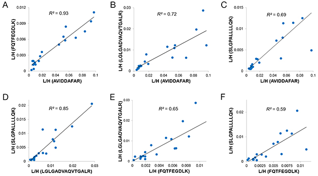 One important feature for targeted MS assays is that multiple surrogate peptides can be selected for a given protein. Each surrogate peptide from a given protein can serve as a unique marker since it may contain unique PTM or other sequence modifications. Without such modifications, the abundances for any two or more surrogate peptides from the same protein should correlate well across many samples. In studies involving human cell lines, most surrogate peptides (453/466) showed a high correlation coefficient (R2 > 0.8) [21]. However, many surrogate peptides used in our urine analysis were found to have moderate correlation coefficients (median R2 = 0.70) with data point deviations. This observation suggests that the target proteins in patient urine samples are more varied than those in single cell lines most likely due to allelic differences or isoforms. Therefore, multiple surrogate peptides per protein need to be tested in assay development and the individual peptide signatures may provide additional values for disease detection.