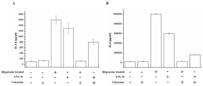 Figure 3: The IL-1β and IL-6 in the supernatant of the A549 cells which were exposed to hyperoxic (Hyperoxic treated), room air(normoxic control) conditions and/or combination with the treatment of adding ANG II or Valsartan, were analyzed by Elisa, Data are expressed as mean±S.D. of three independent experiments.