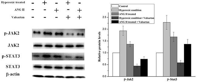 In order to explore the molecular mechanism of inflammation mediated by the overexpression of AGT gene. Several signal pathways which were reported to be associated with the inflammation were investigated, but only the JAK/STAT signal pathway was found to be influenced by the upregulated AGT gene. As shown in Figure 5, the expression of phosphorylated Jak2 and phosphorylated Stat3 were significantly increased in the A549 cell under the hyperoxic condition, the relative expression level of p-Jak2 and p-Stat3 in hyperoxic condition was almost twice than those in the normoxic condition. Whereas adding ANG II play similar roles for A549 cells in elevating the expression of the p-Jak2 and p-Stat3, the p-Jak2 and p-Stat3 were more than the control but less than the hyperoxic treated samples. Moreover, it was found that Valsartan adding can significantly reduce the phosphorylation of the Jak2 and Stat3 caused by hyperoxic treated and ANG II adding, but the protein expression of the Jak2 and Stat3 were no obvious change. In comparison, the Valsartan almost has no effect on the phosphorylation of the Jak2 and Stat3 of the A549 cells which were without the treatment of hyperoxic (Figure 6). These results showed that Hyperoxic treatment increased the expression of AGT gene, the overexpression of AGT promote the activation of the JAK2 and subsequently activated the phosphorylation of Stat3. JAK/STAT, which is the important part of the cell signal pathway and plays a key role in inflammation reaction.