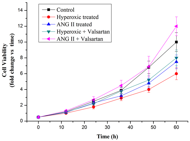 Cell proliferation arrest was the key character of the BPD. To investigate the role of overexpression of AGT on cell proliferation is necessary. Hyperoxic treatment strongly inhibited cell proliferation, as well as the adding ANG II treatment (Figure 7). In contrast, Valsartan, as the blocker of the angiotensin type 1 receptor, significantly restored the cell proliferation which originally inhibited by the hyperoxic treatment, moreover, it was found that with the adding of the Valsartan the cell proliferation of the A549 cells pretreated with ANG II were better than those of the control in 60h. These obtained results indicated that overexpression of AGT gene originated from Hyperoxic treatment suppresses the proliferation of the A549 cells, and the roles of overexpression Agt on the cell proliferation inhibition is dependent on the AGT related signal pathway.