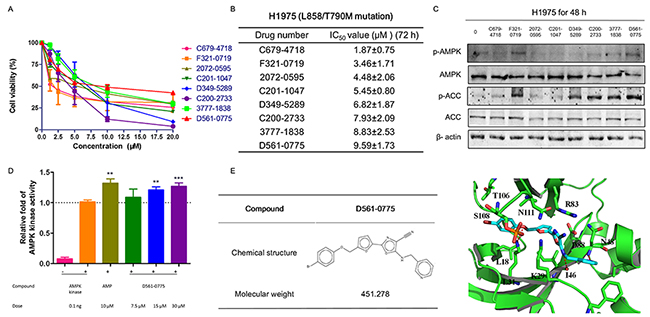 Figure 1: D561-0775 showed cytotoxicity on H1975, and had strongly activation effect on H1975. (A) The dose response curve of 8 compounds on H1975 cells after 72 h treatment. (B) IC50 values of 8 compounds on H1975 cells after 72 h treatment. (C) Western blot analysis of the protein level changes of p-AMPK, p-ACC, total AMPK, total ACC and β-actin after treatment with the 8 compounds for 48 h. (D) D561-0775 has a significantly activation of AMPK enzyme. (E) Chemical structure of D561-0775 and the binding mode of D561-0775 docked into AMPK. The AMPK protein was represented as cartoon. AMPK and key residues around the binding pocket were shown as sticks. The hydrogen bond was labeled as red dashed line. All data were expressed as mean ± SD (n= 3, ** p < 0.01, *** p < 0.001). All western blot images were cropped from full-length blots.