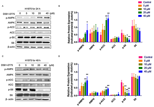 Figure 3: D561-0775 activated AMPK and its downstream signaling molecules. (A & C) D561-0775 phosphorlated AMPK, ACC, and S6 on H1975 for 24 h and 48 h. (B & D) Statistical analysis of p-AMPK, AMPK, p-ACC, ACC, p-S6 after 24 h and 48 h. All data was presented as mean ± SD (n= 3, * p < 0.05, ** p < 0.01). All western blot images were cropped from full-length blots.