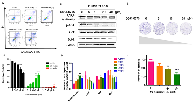 Figure 4: D561-0775 significantly induced apoptosis in H1975. (A) Flow cytometric analysis of the apoptosis level after D561-0775 treatment for 48 h. (B) Statistical analysis result of apoptosis data. (C) PARP was cleaved by D561-0775, while p-AKT, Bcl-2 were decreased by treating with D561-0775 for 48 h. (D) Statistical analysis of the densitometry of the signals of cleaved PARP, p-AKT, AKT, Bcl-2. (E) Photomicrographs of colony formation assay data after treatment with D561-0775 at different doses (0, 5, 10, 20 μM). (F) Statistical analysis of colony formation assay. All data was presented as mean ± SD (n= 3, * p < 0.05, ** p < 0.01, *** p < 0.001). All western blot images were cropped from full-length blots.