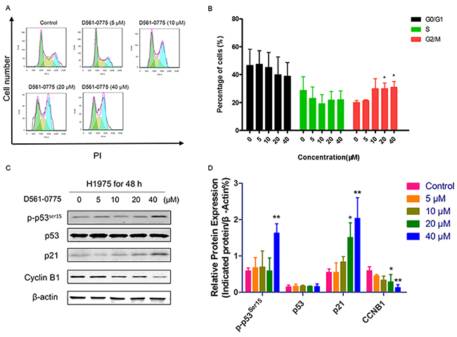 Figure 5: D561-0775 induced cell cycle arrest in H1975 cells. (A) H1975 cells were treated with D561-0775 at different concentration for 48 h. (B) Statistical analysis of cell cycle distribution after 48 h drug treatment. (C) Western blot analysis of the protein levels of p-p53ser15, p53, p21, Cyclin B1 and β-actin after 48 h drug treatment. (D) Statistical analysis of the densitometry signals of p-p53ser15, p53, p21 and Cyclin B1. All data was presented as mean ± SD (n= 3, * p < 0.05, ** p < 0.01). All western blot images were cropped from full-length blots.