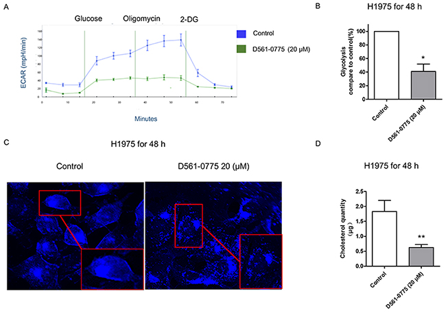 Figure 6: D561-0775 suppressed glycolysis and cholesterol synthesis in H1975. (A) The ECAR value decreased after treatment with D561-0775 for 48 h. (B) The statistical analysis result of glycolysis for 48 h. (C) Cholestrol staining after incubating with D561-0775 at 20 μM on H1975 for 48 h, magnified 40X dimension. (D) Quantification of the cholestrol level of H1975 after 48 h treatment with D561-0775. All data were presented as mean ± SD (n = 3, *p < 0.05, ** p < 0.01).