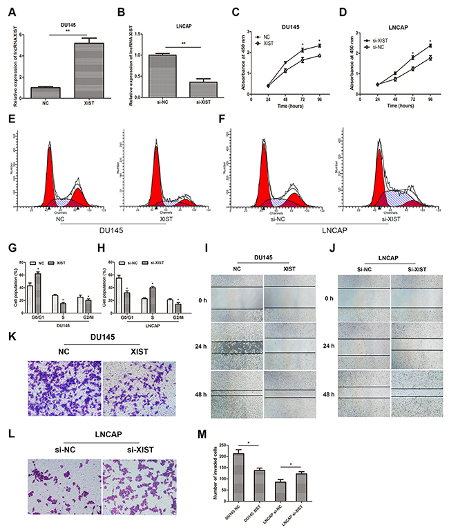 Figure 2: Influence of lncRNA XIST on the malignant phenotypes of prostate cancer in vitro. (A, B) Relative expression of XIST in DU145 or LNCAP cells after transfection with XIST or si-XIST. **P<0.01 vs. NC group or si-NC group. (C, D) CCK-8 assays were performed to determine cellular proliferation in DU145 cells transfected with XIST and LNCAP cells transfected with si-XIST. *P<0.05 vs. NC group or si-NC group. (E, G) Cell cycle of DU145 cells transfected with XIST or NC was detected by flow cytometry. *P<0.05 vs. NC group. (F, H) Cell cycle of LNCAP cells transfected with si-XIST or si-NC was examined by flow cytometry. *P<0.05 vs. si-NC group. (I, J) Wound healing assays were performed to evaluate cell migratory ability in DU145 cells transfected with XIST or NC and LNCAP cells transfected with si-XIST or si-NC. (K-M) Transwell invasion assays were performed to examine invasive ability in cells. Cell number was counted in five random fields at 200 × magnification. *P<0.05 vs. NC group or si-NC group. Data are presented as mean ± SD from three separated experiments.