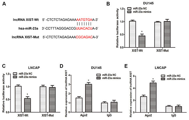 Figure 4: XIST inhibits miR-23a expression by directly targeting it. (A) Putative binding site of miR-23a on XIST. (B, C) Dual-luciferase reporter assays were performed to determine luciferase activity in DU145 and LNCAP cells co-transfected with miR-23a mimics and XIST-Wt or XIST-Mut. *P<0.05 vs. miR-23a NC group. (D, E) RNA-IP assays were performed in DU145 and LNCAP cells transfected with miR-23a mimics and miR-23a NC. The expression of XIST was determined by qRT-PCR. *P<0.05 vs. miR-23a NC group. Data are presented as mean ± SD in three independent experiments.