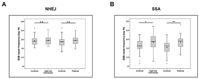 Mean log10 transformed DSB repair frequencies and PARP activities were compared between high-risk individuals and controls, as well as between patients and controls by unpaired t tests. Confirmatory analyses were performed using General Linear Models adjusted for age. Comparisons among groups are illustrated using Box-and-Whisker plots, where the horizontal line inside the box represents the median, a black square denotes the mean, and the box indicates the interquartile range (IQR; the middle 50% of scores). The ends of the whiskers denote the lowest and highest values still within 1.5 IQR of the lower and upper quartile (i.e. the lower and upper end of the box), respectively. If there are no values more than 1.5 IQR below the lower or above the upper quartile (i.e. outliers), the ends of the whiskers denote minimum and maximum of the data. Outliers that are more than 1.5 IQR but less than 3 IQR below the lower or above the upper quartile are indicated by open circles, and extreme outliers more than 3 IQR below the lower or above the upper quartile are indicated by stars.