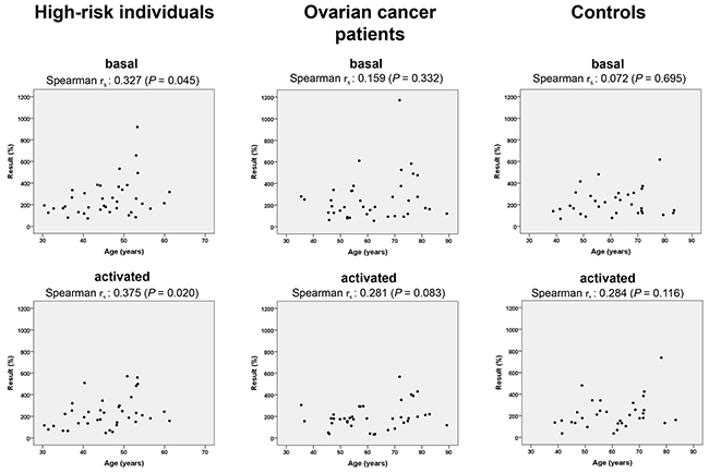 Associations of DSB repair frequencies, PARP activities or drug sensitivities with age were evaluated using the non-parametric Spearman rank correlation coefficient rs and illustrated using scatter plots.