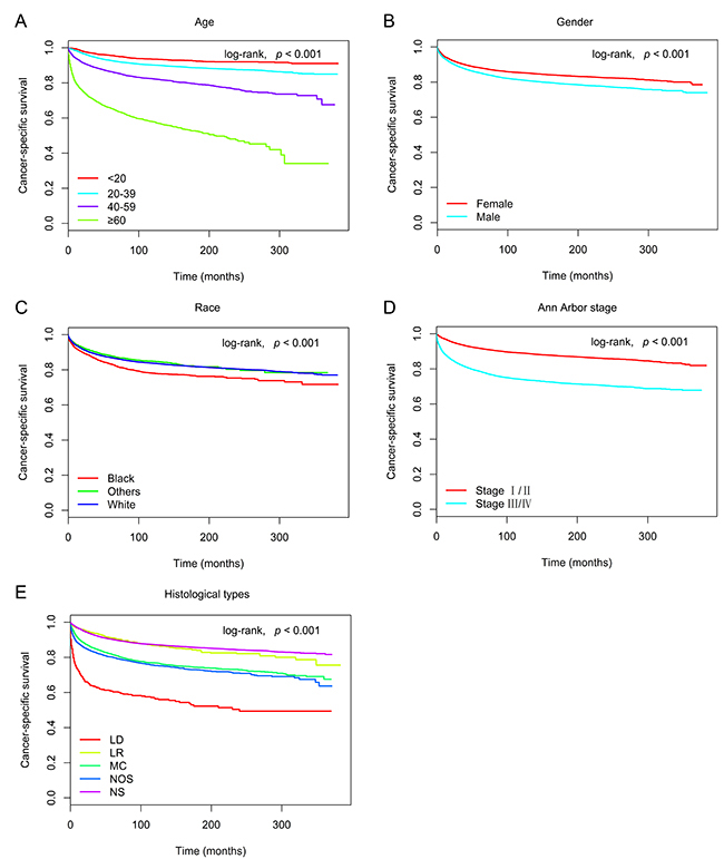 Figure 2: Kaplan-Meier survival curves for cancer-specific survival in the training cohort, as stratified by (A) age (log-rank, χ2 = 3.36E+03, p < 0.001), (B) gender (log-rank, χ2 = 7.98E+01, p < 0.001), (C) race (log-rank, χ2 = 5.24E+01, p < 0.001), (D) Ann Arbor stage (log-rank, χ2 = 1.00E+03, p < 0.001), and (E) histological type (log-rank, χ2 = 9.50E+02, p < 0.001). Abbreviations: LD, lymphocyte-depleted; LR, lymphocyte-rich; MC, mixed cellularity; NOS, not otherwise specified; NS, nodular sclerosis.