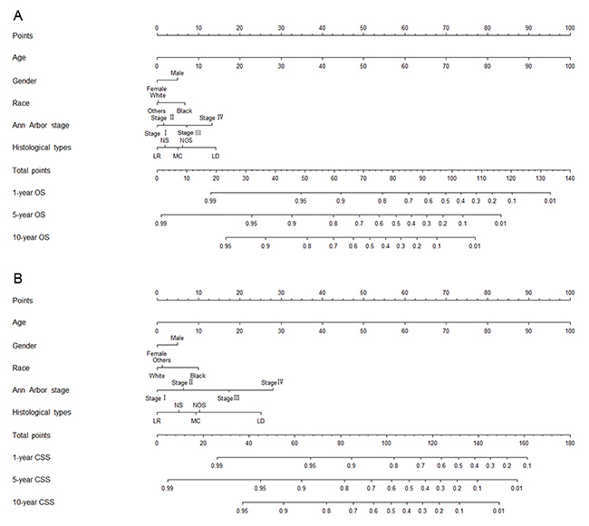 Figure 3: Nomograms for predicting the 1-, 5-, and 10-year (A) overall survival and (B) cancer-specific survival of classical Hodgkin lymphoma patients. Abbreviations: OS, overall survival; CSS, cancer-specific survival; LD, lymphocyte-depleted; LR, lymphocyte-rich; MC, mixed cellularity; NOS, not otherwise specified; NS, nodular sclerosis.