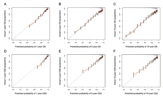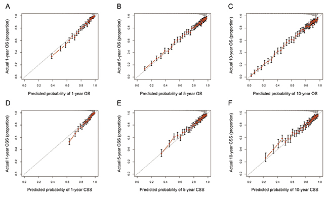 Figure 5: The calibration curves for predictions of overall survival (A-C) and cancer-specific survival (D-F) in the validation cohort at 1, 5, and 10 years after diagnosis. The dashed line represents perfect correspondence between the nomogram-predicted probability (x-axis) and the actual probability calculated from a Kaplan-Meier analysis (y-axis). A perfectly accurate nomogram prediction model would result in a plot where the actual and predicted probabilities, for the given groups, fall along the 45° line. The distance between the pairs and the 45° line is a measure of the absolute error of the nomogram’s prediction. Abbreviations: OS, overall survival; CSS, cancer-specific survival.
