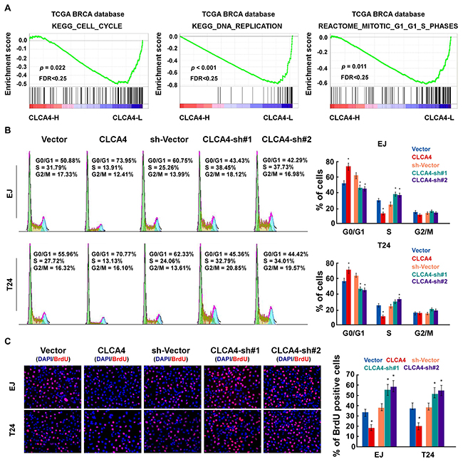 Figure 3: CLCA4 inhibits cell cycle in bladder cancer cells. (A) GSEA results indicated that CLCA4 expression was significantly correlated with the cell cycle-associated gene signatures. (B) Flow cytometric analysis showing the percentages of CLCA4-overexpressing and CLCA4-shRNA transfected cells at different phases of the cell cycle. (C) Representative micrographs (left panel) and quantification (right panel) of EdU incorporation in the indicated bladder cancer cells. DAPI was used as a DNA/nuclear stain.