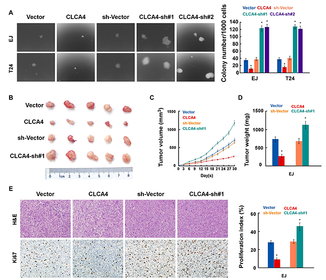 Figure 5: CLCA4 overexpression enhances the tumorigenicity of bladder cancer cells. (A) Representative micrographs (left) and quantification (right) of colonies formed by the indicated cells, determined by anchorage-independent growth ability assays. (B) Representative images of the tumors from Xenograft model in nude mice. (C) Tumor volumes were measured on the indicated days. (D) Tumor weights of allmice in each group. (E) H&E and immunohistochemical staining showed that overexpression of CLCA4 inhibited, whereas suppression of CLCA4 induced the tumorigenicity. Data are mean ± SD of three independent experiments. *P < 0.05.