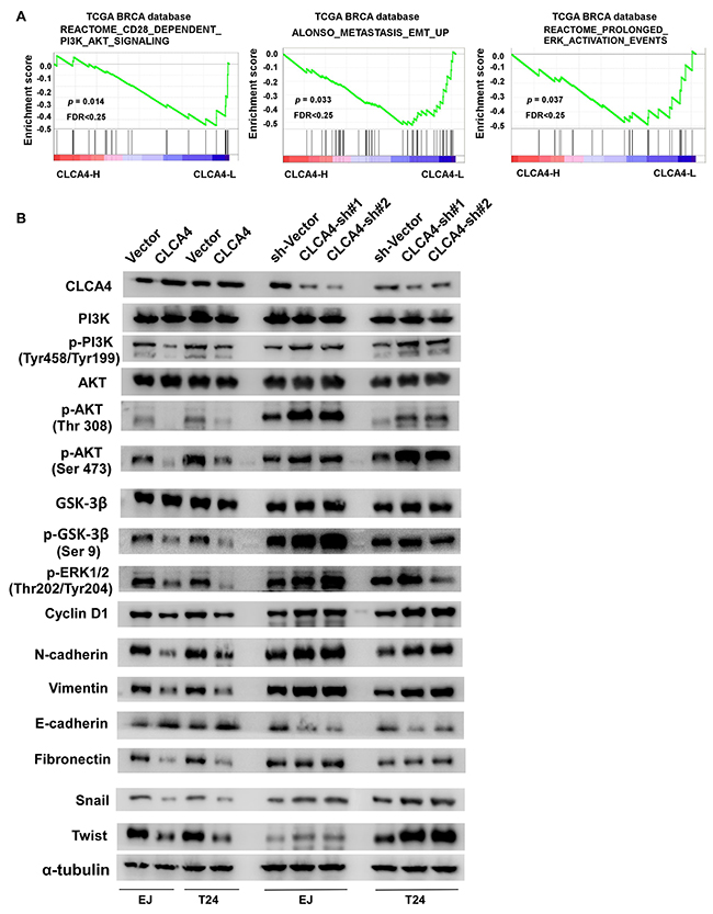 Figure 6: CLCA4 regulates bladder cancer cell proliferation and invasion via PI3K/AKT signaling pathway. (A) GSEA plot showing that CLCA4 expression negatively correlated with PI3K/AKT, ERK-activated and EMT related gene signatures. (B) Protein levels of PI3K, p-PI3K, AKT, p-AKT, GSK3β, p-GSK3β, p-ERK1/2, CyclinD1, epithelial and mesenchymal makers, and transcription factors were shown in indicated cells. α-tubulin was used as a loading control.