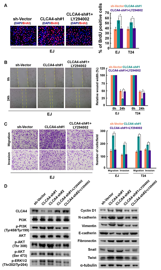 Figure 7: CLCA4 knockdown promoted bladder cancer cell proliferation and invasion are blocked by LY294002. CLCA4-shRNA transfected cells were treated with PI3K inhibitor LY294002, and applied to proliferation, migration and invasion assays. (A) Representative images (left panel) and quantification (right panel) of EdU labeling in the indicated cells. (B) Representative images (left panel) and quantification (right panel) of migrating cells based on a wound healing assay. (C) Representative images (left panel) and quantification (right panel) of invading cells based on transwell and Matrigel assays. Bars represent the mean± SD of three independent experiments. *P< 0.05. (D) Protein levels of PI3K, p-PI3K, AKT, p-AKT, p-ERK1/2, epithelial and mesenchymal makers, and transcription factors were compared in indicated cells. α-tubulin was used as a loading control.