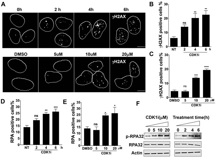 Figure 1: Short-term exposure to CDK1 inhibitors leads to a DNA damage response in a time- and dose-dependent manner. A. Representative images of γH2AX foci formation in U2OS cells treated with 10 µM CDK1 inhibitor (CDK1i) for the indicated times (upper panel) or with increasing concentrations of CDK1i for 4 hours (lower panel); DMSO, dimethyl sulfoxide; scale bar, 20 µm; B.-C. Quantification of the data from the upper and lower panels of A. Cells with over 5 γH2AX foci were counted as positive cells; D.-E. Quantification of RPA foci in U2OS cells treated with 10 µM CDK1i for the indicated times D. and in U2OS cells exposed to increasing concentrations of RO3306 for 4 hours E.. Cells having more than three RPA foci were considered to be RPA positive; F. Immunoblot analysis for indicated proteins in the whole cell extracts from U2OS cells treated as graphed. Actin was used as a loading control. Data are from three independent experiments and are presented as the means±SEM. To determine significance, a one-way ANOVA followed by Dunnett’s multiple comparison post-test was performed for B-E. A Student’s t-test was performed: *, p < 0.05; **, p < 0.01; ***, p < 0.001; ****, p < 0.0001; ns, not significant.