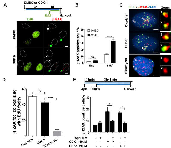 Figure 2: CDK1 inhibition induces a DNA damage response mainly in replicating cells. A. Representative immunofluorescence images of γH2AX foci in DMSO- or CDK1i-treated U2OS cells. EdU staining was used to label replicating cells. White and green arrows denote non-replicating cells and replicating cells, respectively, and white circles are outlines of cell nuclei. An experimental scheme is shown at the top. Scale bar, 10 µm; B. Quantification of γH2AX foci in EdU-negative and -positive U2OS cells treated as indicated in A. C. Representative images of single cell-based analysis of colocalization of γH2AX foci and replication sites marked by EdU after the indicated treatment according to the scheme shown in A, insets on the right side are enlarged images of colocalization of γH2AX foci to EdU foci. Scale bar, 5 µm. D. Quantification of the percentage of γH2AX foci colocalizing with EdU foci in cells from C., cisplatin and bleomycin were used as the positive and negative controls, respectively, and at least 30 individual cells were analyzed for each group. E. Quantification of γH2AX foci in U2OS cells treated with or without CDK1i in the absence or presence of aphidicolin. The experimental scheme is shown at the top. Data were obtained from three independent experiments and are presented as the means±SEM. To calculate significance, a two-way ANOVA followed by a Sidak multiple comparison post-test was used for B. and E., and a one-way ANOVA followed by Dunnett’s multiple comparison post-test was performed for D. *, p < 0.05; ****, p < 0.0001; ns, not significant.