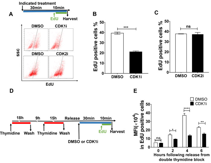 Figure 3: CDK1 activity is required to promote nascent DNA synthesis. A. Representative FACS data from U2OS treated with the indicated inhibitors for 40 minutes and then pulse-labeled with EdU in the last 10 minutes of the incubation period. EdU-positive cells were gated as shown by the black line. The experimental scheme is shown at the top. B.-C. Quantification of EdU-positive cells gated from A. D. Workflow to determine the effects of CDK1i on DNA replication in different stages of S phase. E. Quantification of mean fluorescence intensity (MFI) in EdU-positive cells after the treatments applied according to the scheme shown in D. Data in B. and C. are pooled from three independent experiments and are presented as the means±SEM. Two independent experiments were conducted for B. and data are presented as the mean±SEM. A Student’s t-test was performed for B. and B. to determine significance. Multiple t-tests were performed for E. *, p < 0.05; **, p < 0.01, ****, p < 0.0001; ns, not significant.
